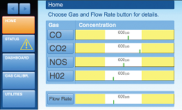 Home screen focuses on the primary user task, monitor gas concentrations and the flow rate. Using a 'gauge' visual metaphor, users can quickly identify acceptable and problematic readings. By touching a particular gas button, users can retrieve precise gauge information and time-based histograms.